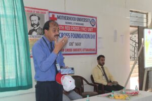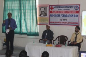 Red Cross Foundation Day was celebrated at Motherhood University, Roorkee with great enthusiasm and in a dignified atmosphere. On this occasion, Hon’ble Vice-Chancellor Prof. (Dr.) Narendra Sharma, in his inspiring address, stated that Red Cross volunteers have set an ideal before society by embracing service, dedication, and human values. Director of Administration, Mr. Deepak Sharma, in his speech, emphasized that activities such as blood donation, first aid, health education, and disaster management have become essential needs of the present time.